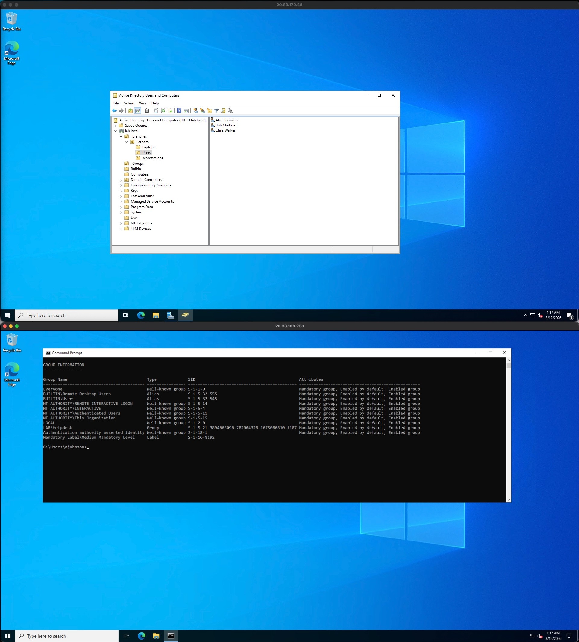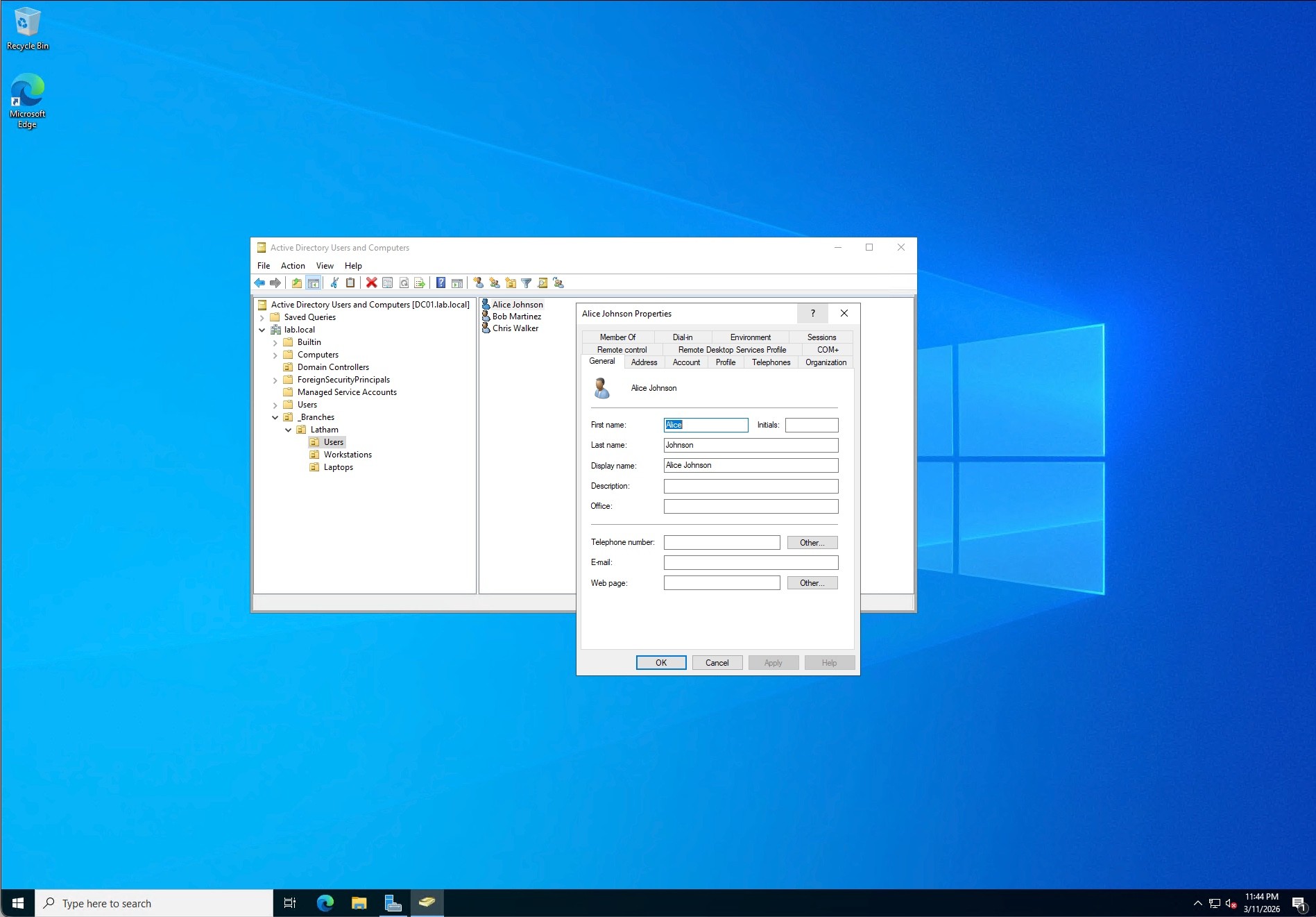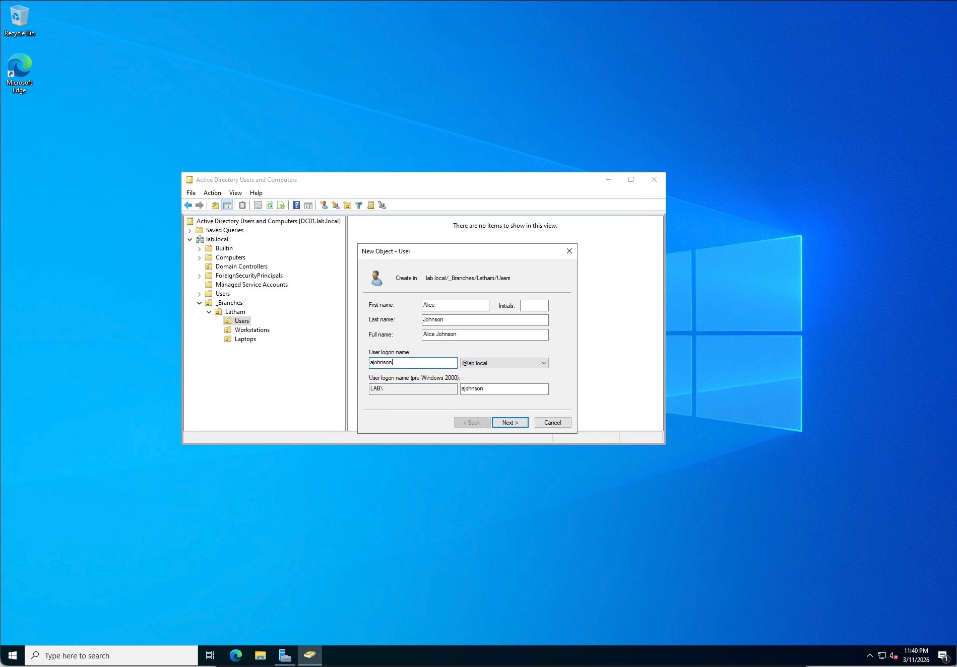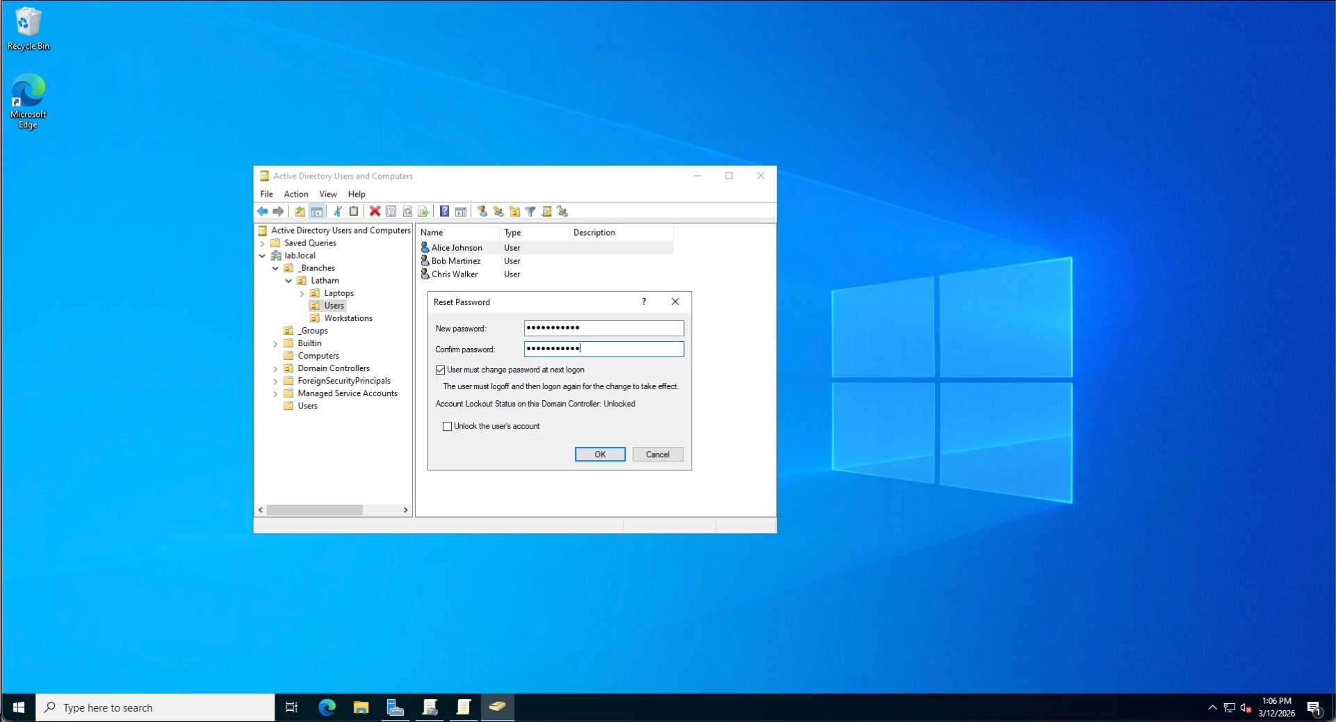 I provisioned several test identities into the Latham\Users OU, standardizing the naming conventions (e.g., Alice Johnson as ajohnson). To streamline this process and demonstrate automation capabilities, I utilized PowerShell cmdlets (New-ADUser) to generate the accounts.