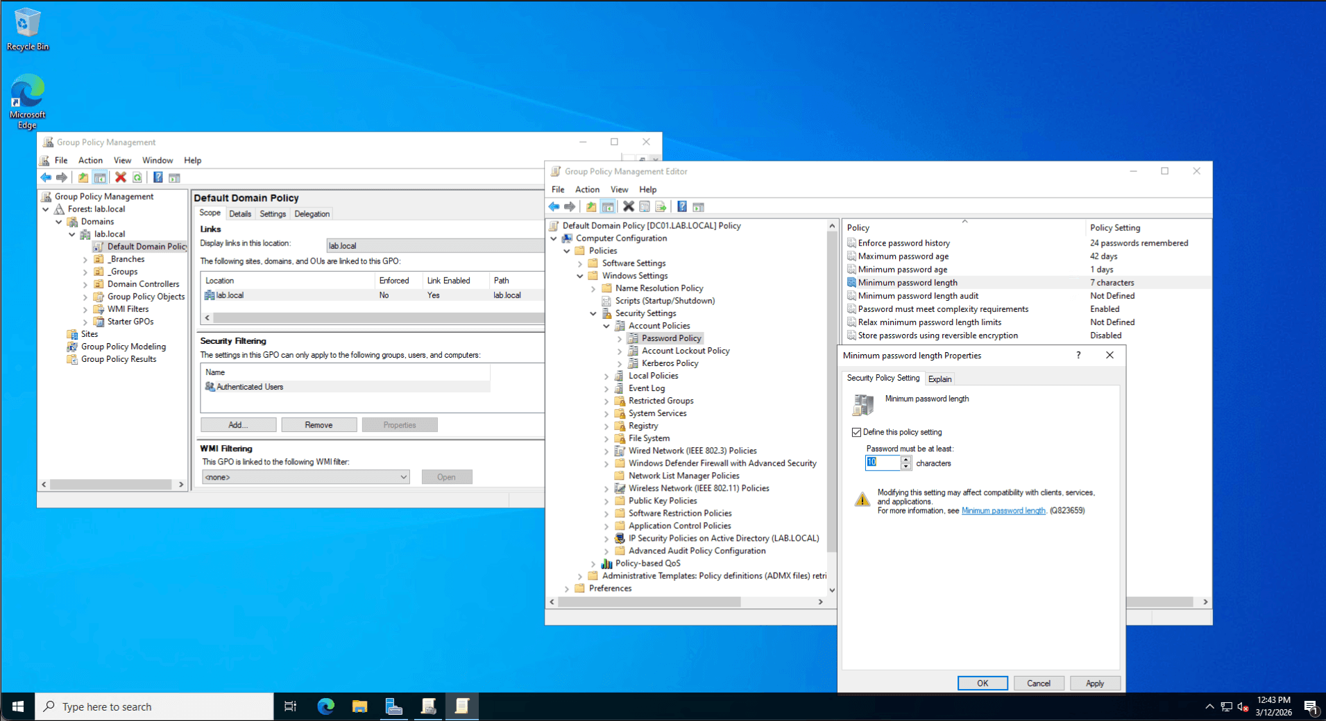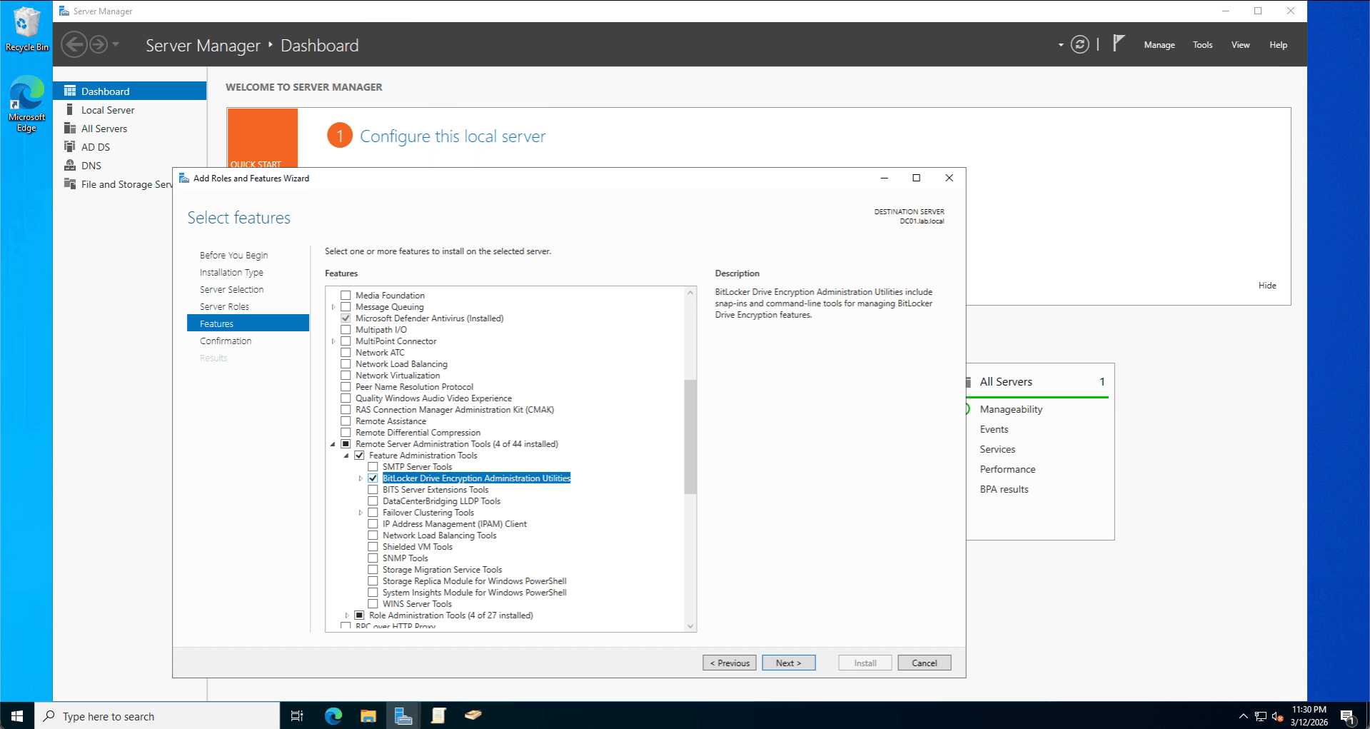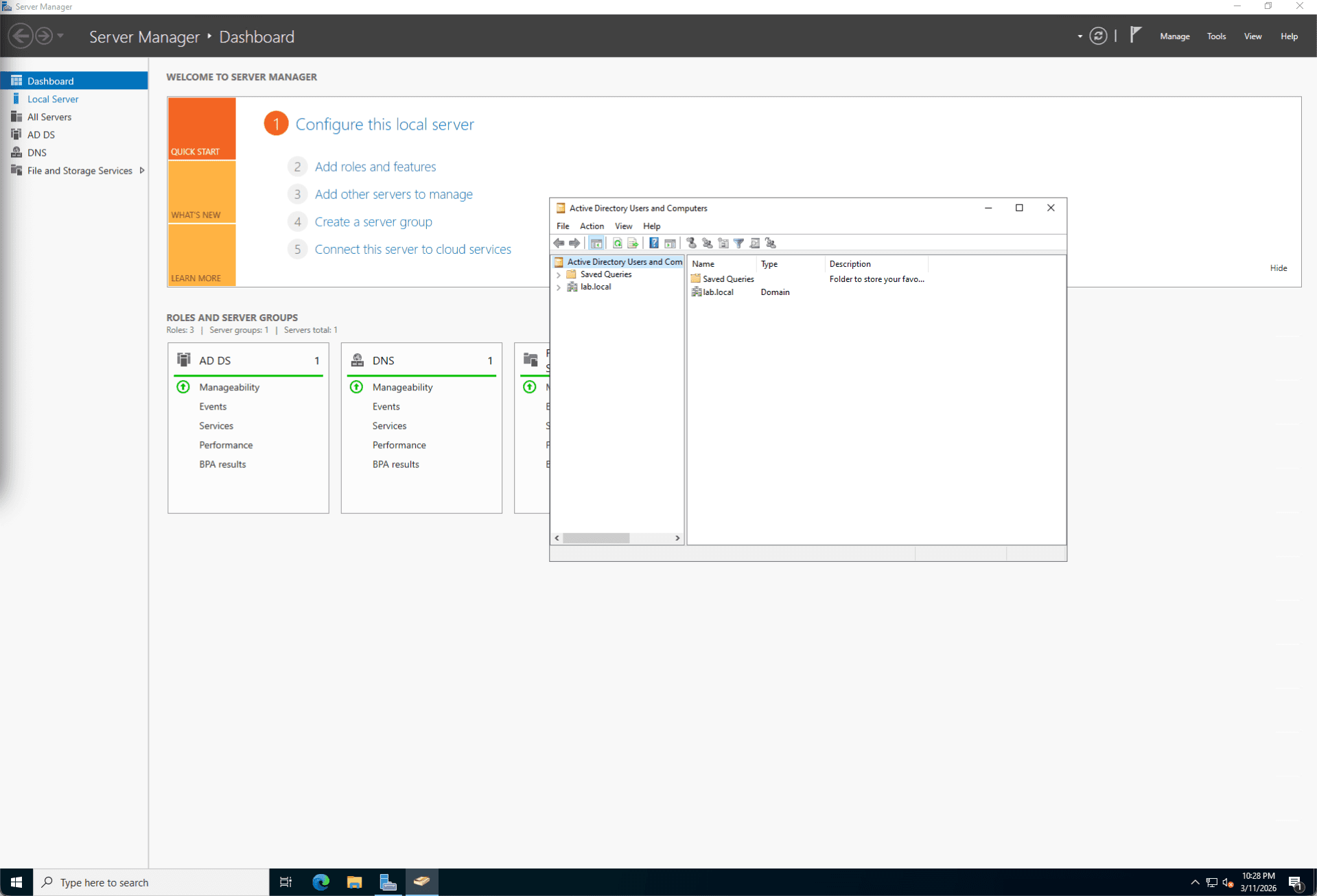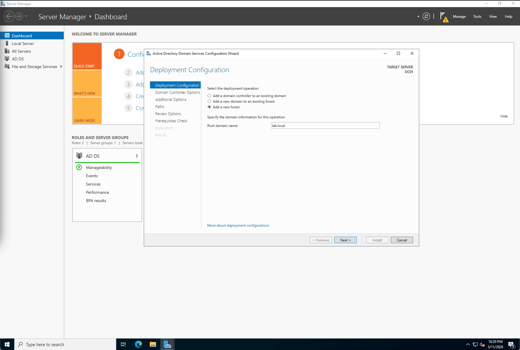 Once the AD DS binaries were installed, I promoted the server to a Domain Controller, establishing a new forest root named lab.local. During this process, I integrated the DNS Server role and configured the server as a Global Catalog (GC). I also established a Directory Services Restore Mode (DSRM) password, ensuring disaster recovery protocols were in place should the Active Directory database (NTDS.dit) ever become corrupted.