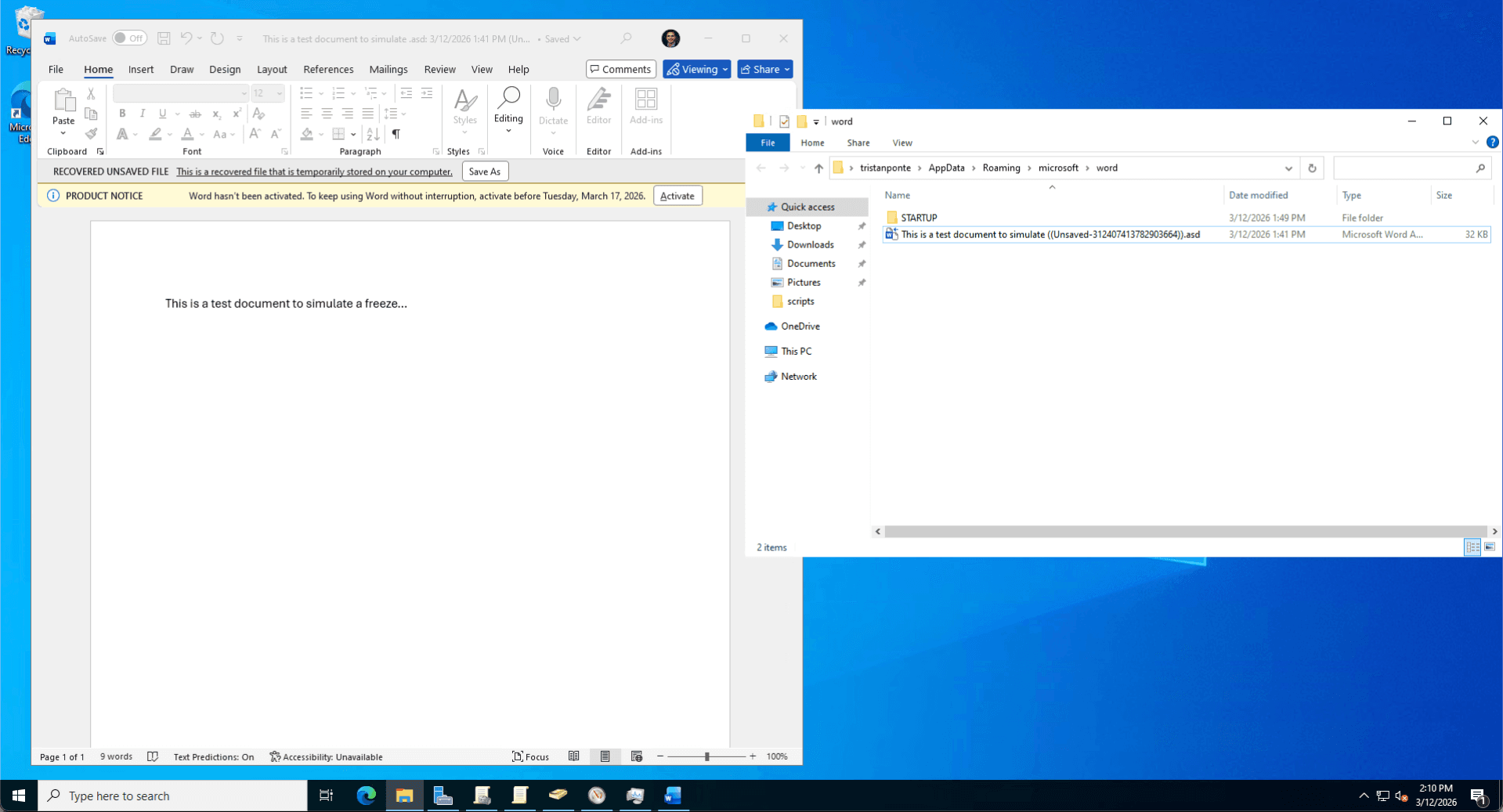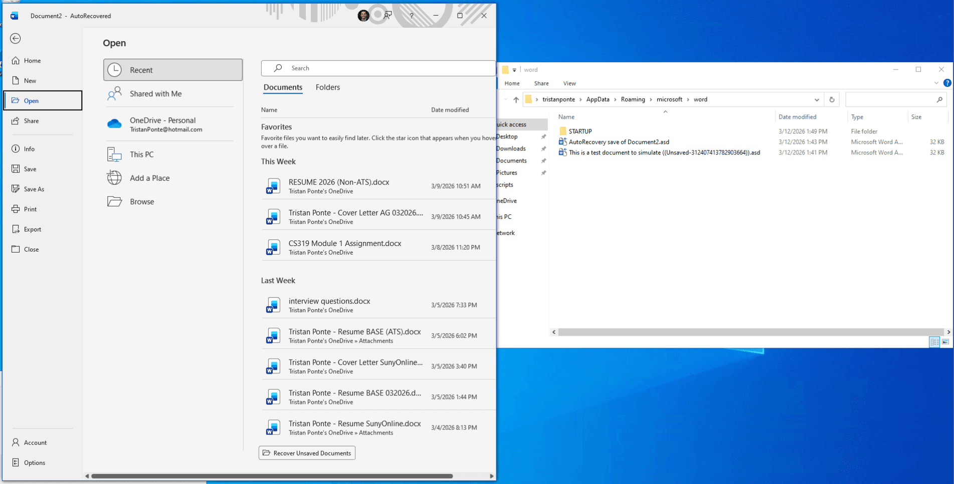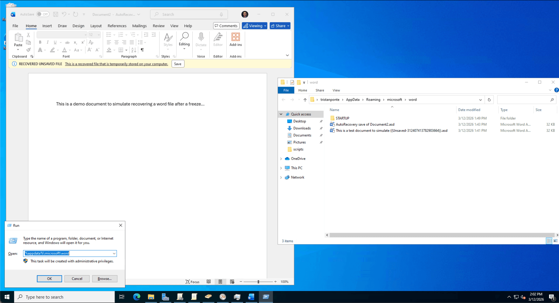 The Fix: I performed manual file system forensics, navigating to the hidden %AppData%\Microsoft\Word directory to locate the binary .asd snapshot file. Utilizing Word's internal "Recover Text from Any File" converter, I successfully extracted the user's unsaved draft, preventing total data loss.