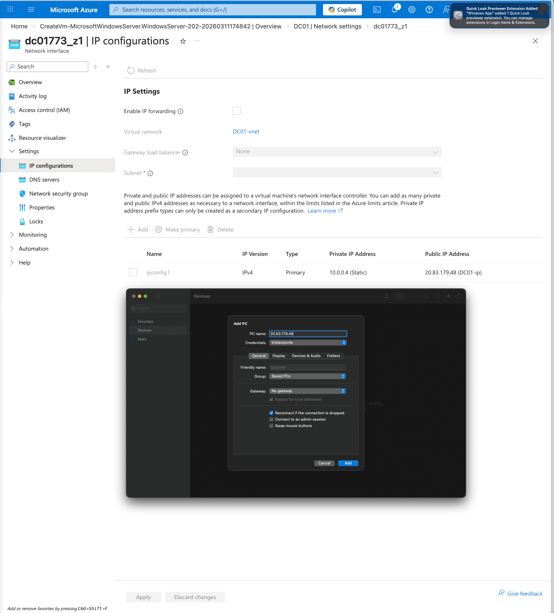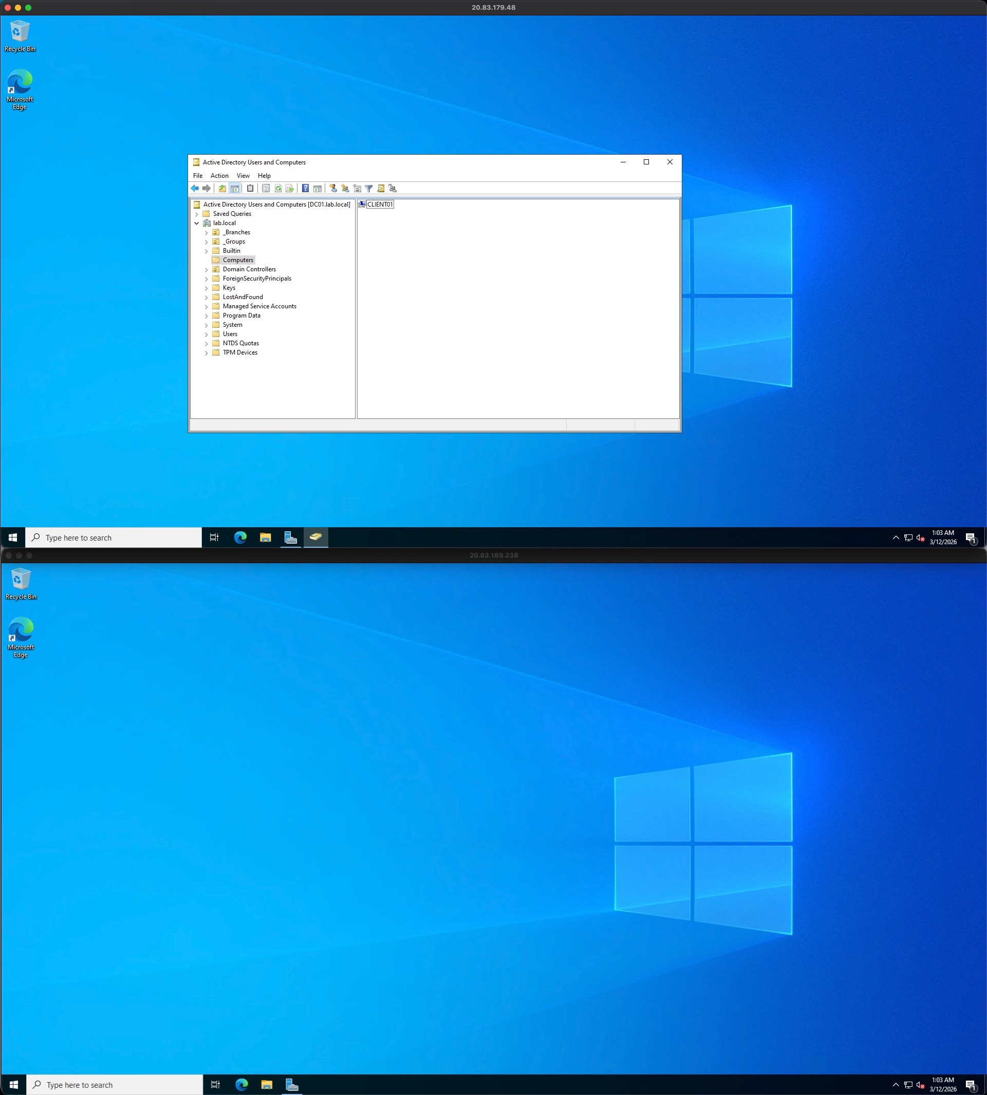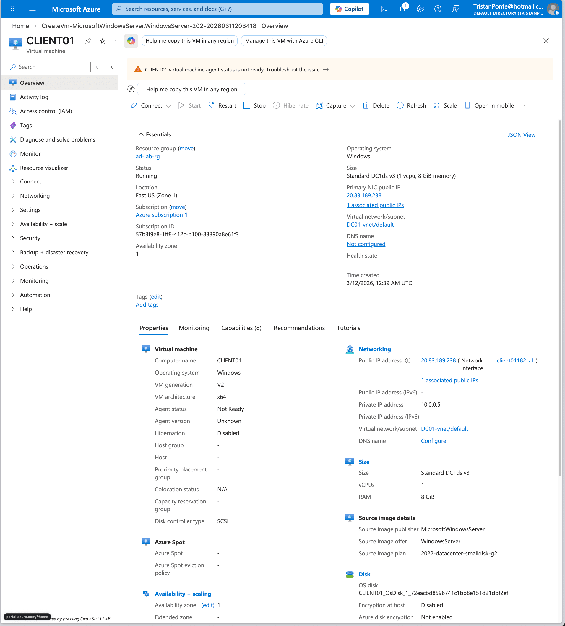 To establish the environment, I provisioned two virtual machines in Microsoft Azure: a Windows Server 2022 Datacenter instance (DC01) to act as the primary Domain Controller, and a Windows 10/11 client instance (CLIENT01) to simulate an end-user workstation. I configured a custom Virtual Network (VNet) to ensure both machines could communicate securely. A critical step in this phase was assigning a Static Private IP to the domain controller to prevent DNS resolution failures and ensure authentication stability across the network.