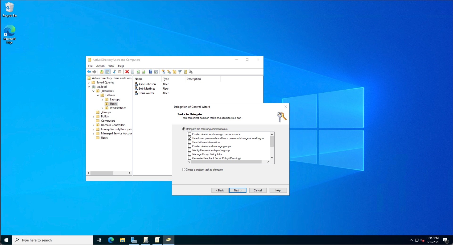 The Fix: Instead of escalating to a Domain Admin, I utilized the Delegation of Control Wizard to grant the Helpdesk security group the specific right to "Reset user passwords" for the Latham OU. I then successfully reset the user's password, forcing a change at the next logon to maintain security compliance.