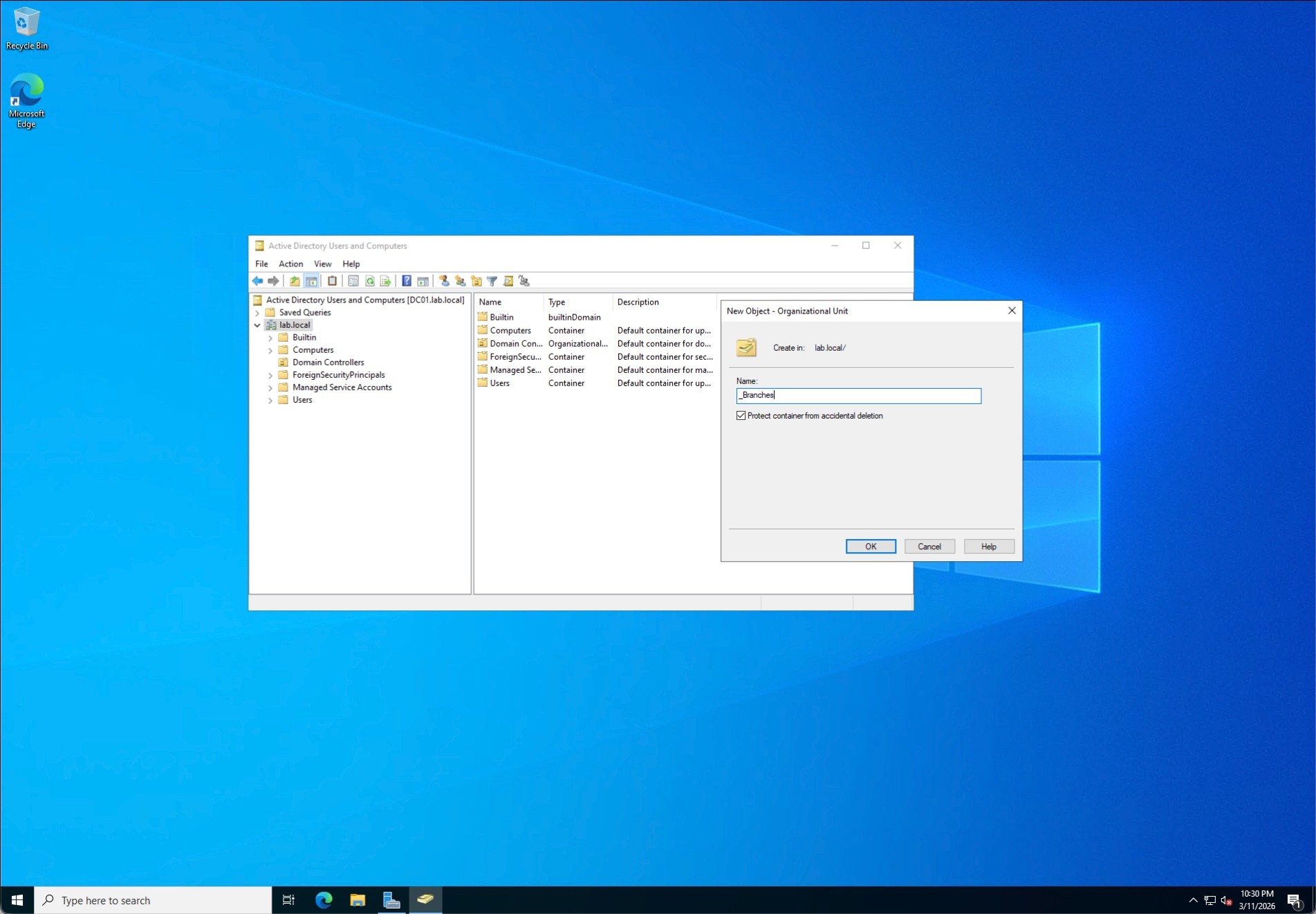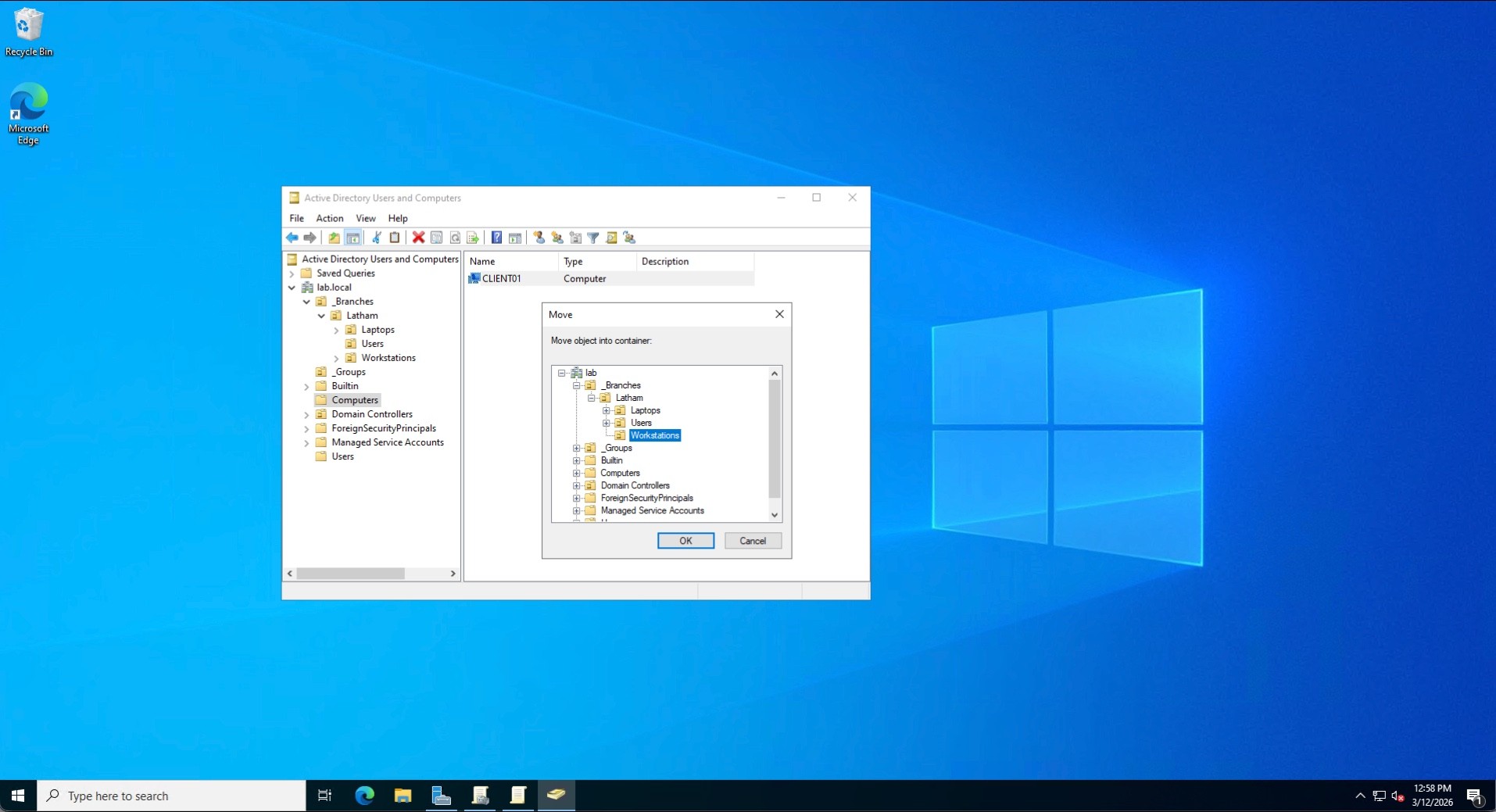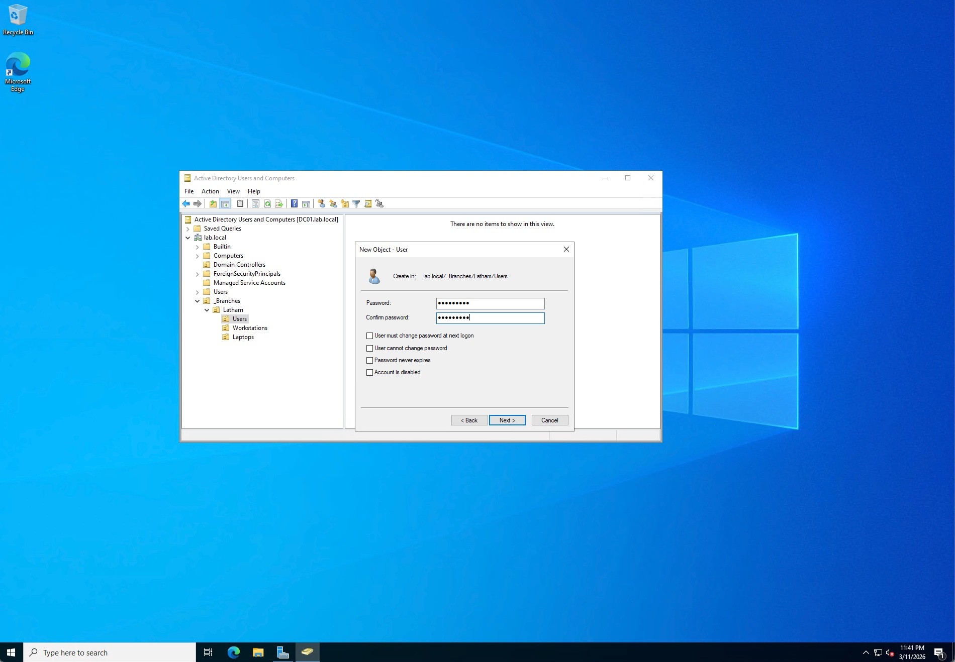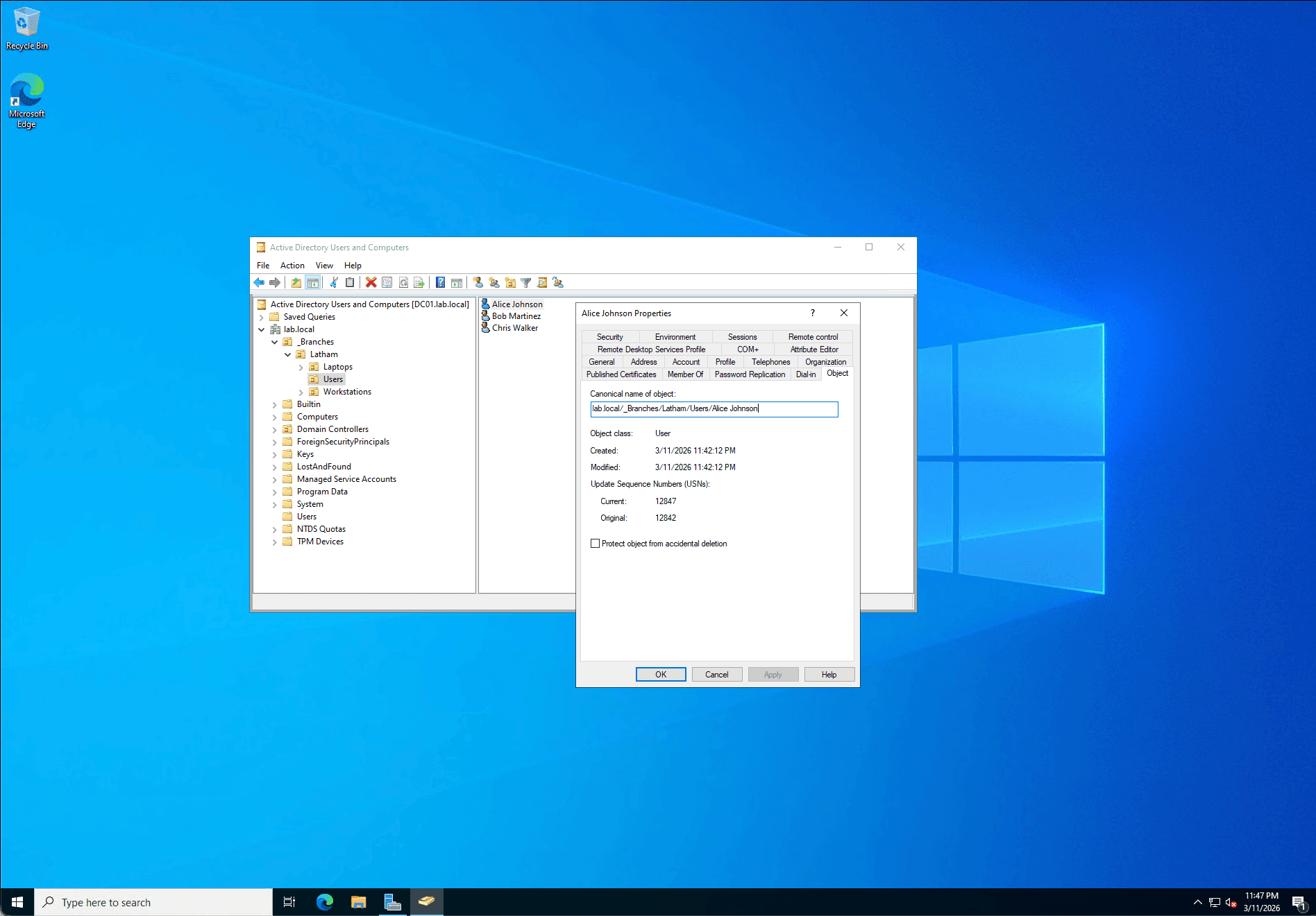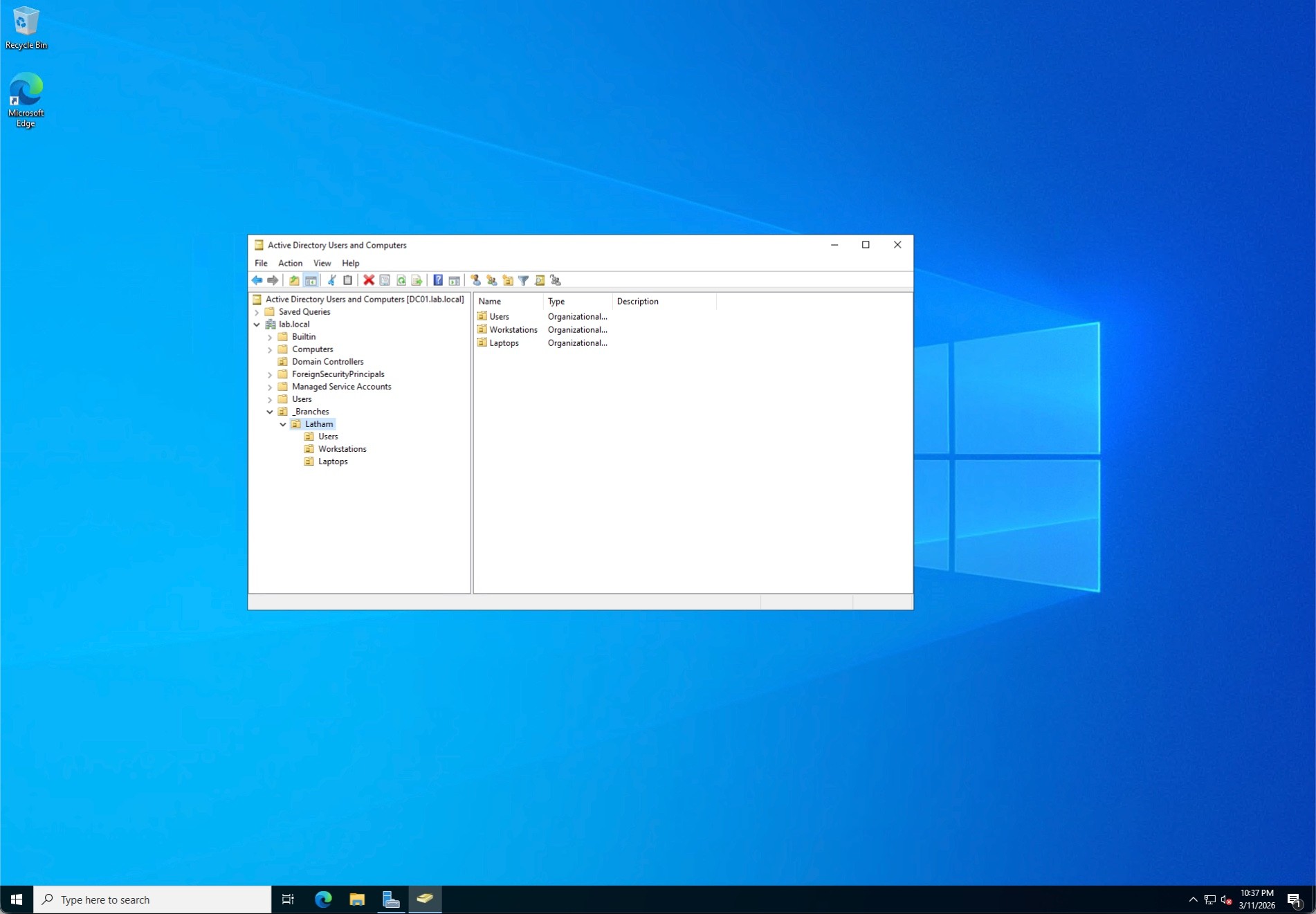 Rather than using the default, flat Active Directory containers, I designed a scalable, location-based Organizational Unit (OU) hierarchy. I created a top-level _Branches OU, and within it, established a Latham branch OU containing sub-folders for Users, Workstations, and Laptops. This structure mirrors real-world enterprise environments, allowing for targeted Group Policy Object (GPO) application and secure Delegation of Control for regional IT staff. I also ensured "Protect container from accidental deletion" was enabled across the board.