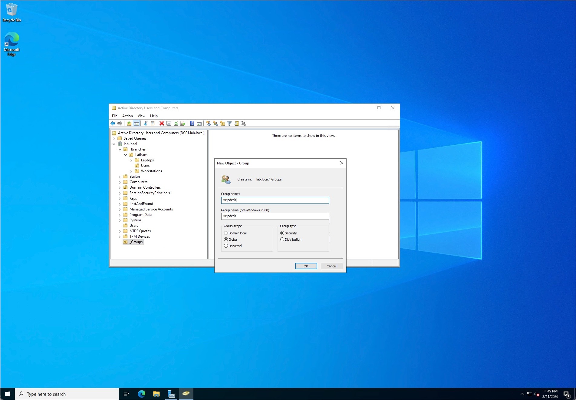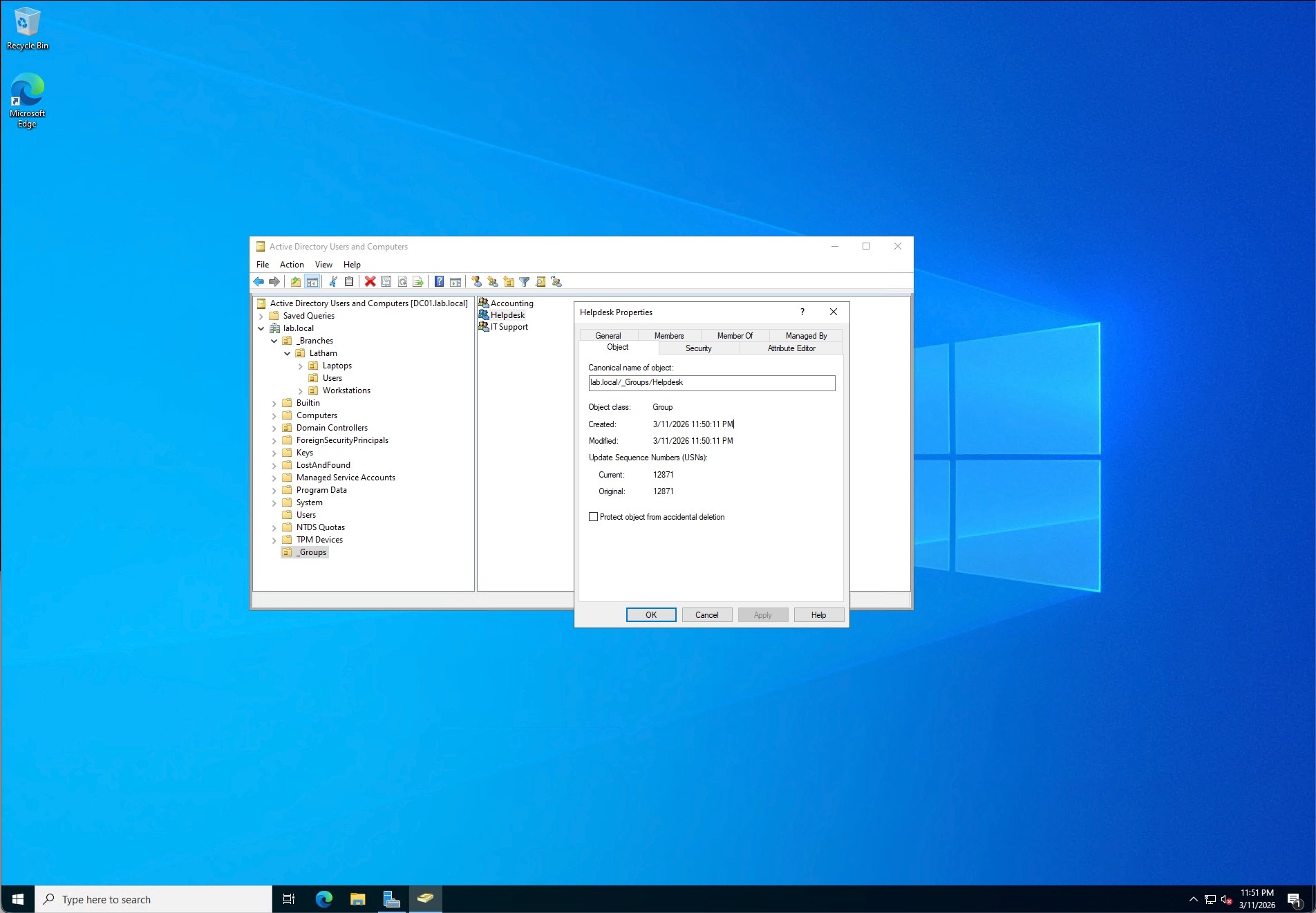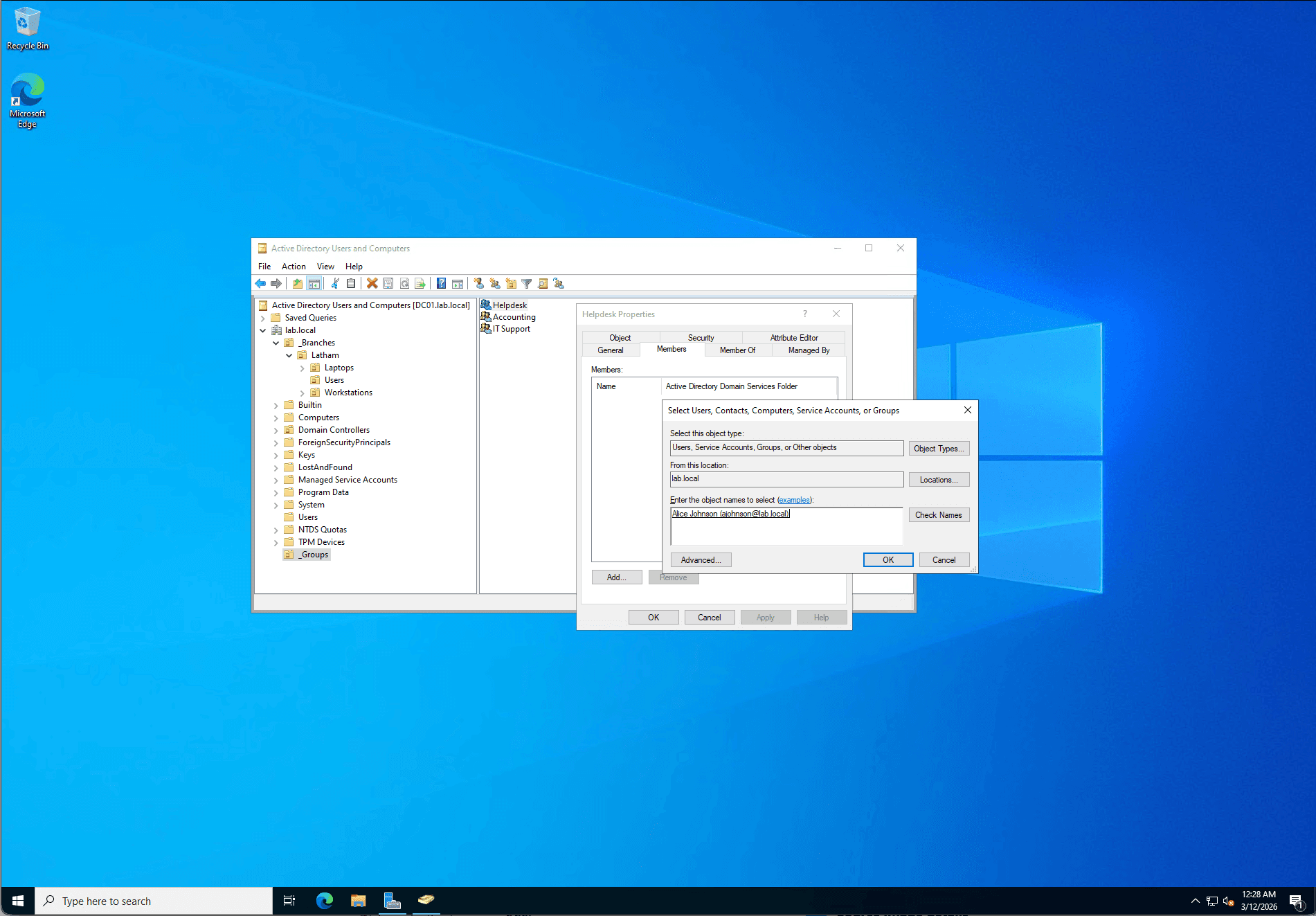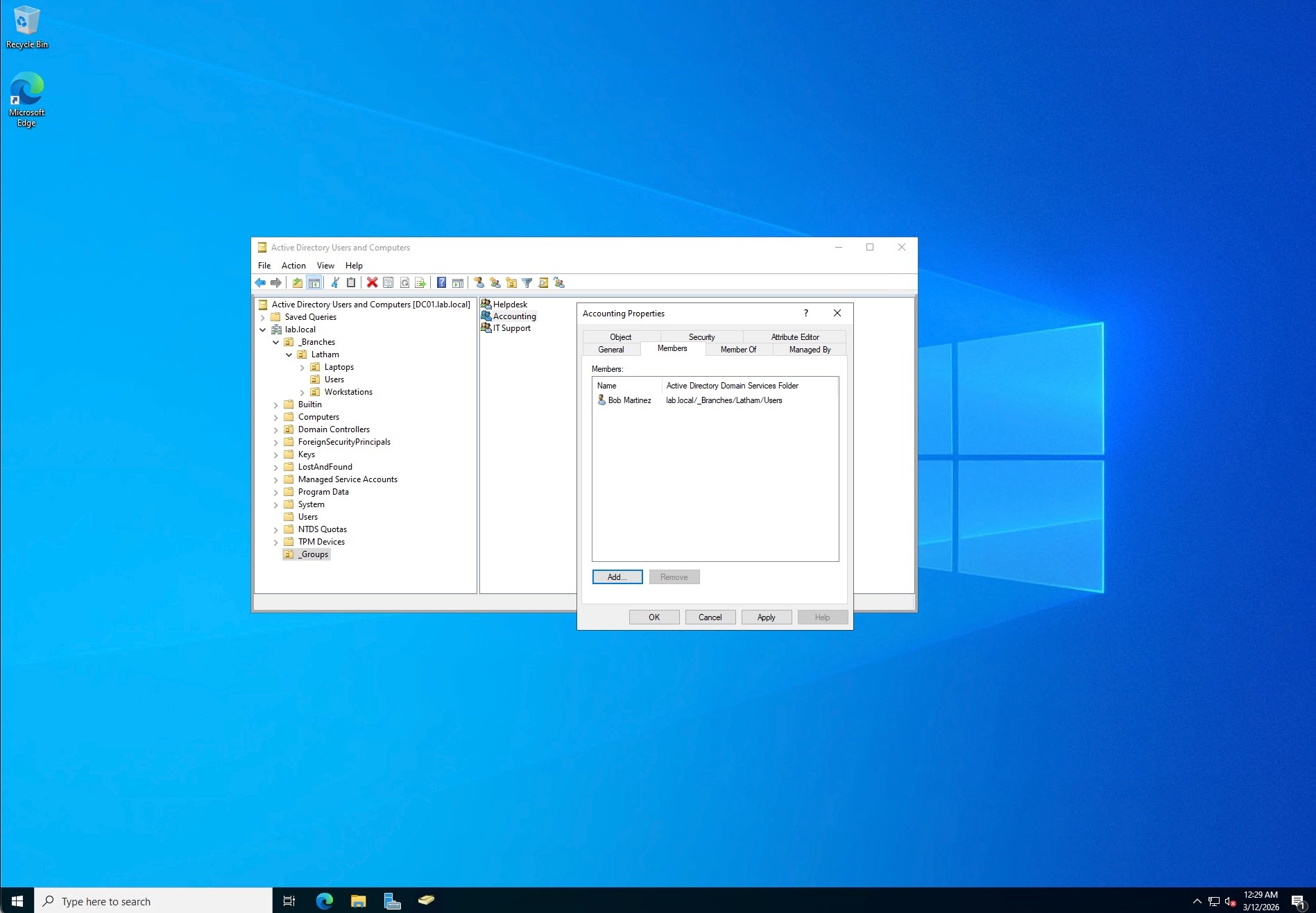 To manage permissions securely, I created a centralized _Groups OU at the domain root. Inside, I established Global Security Groups including Helpdesk, Accounting, and ITSupport. I then assigned the newly created users to their respective groups. This setup ensures that access to network resources is granted via group membership rather than individual user assignment, adhering to the Principle of Least Privilege.
