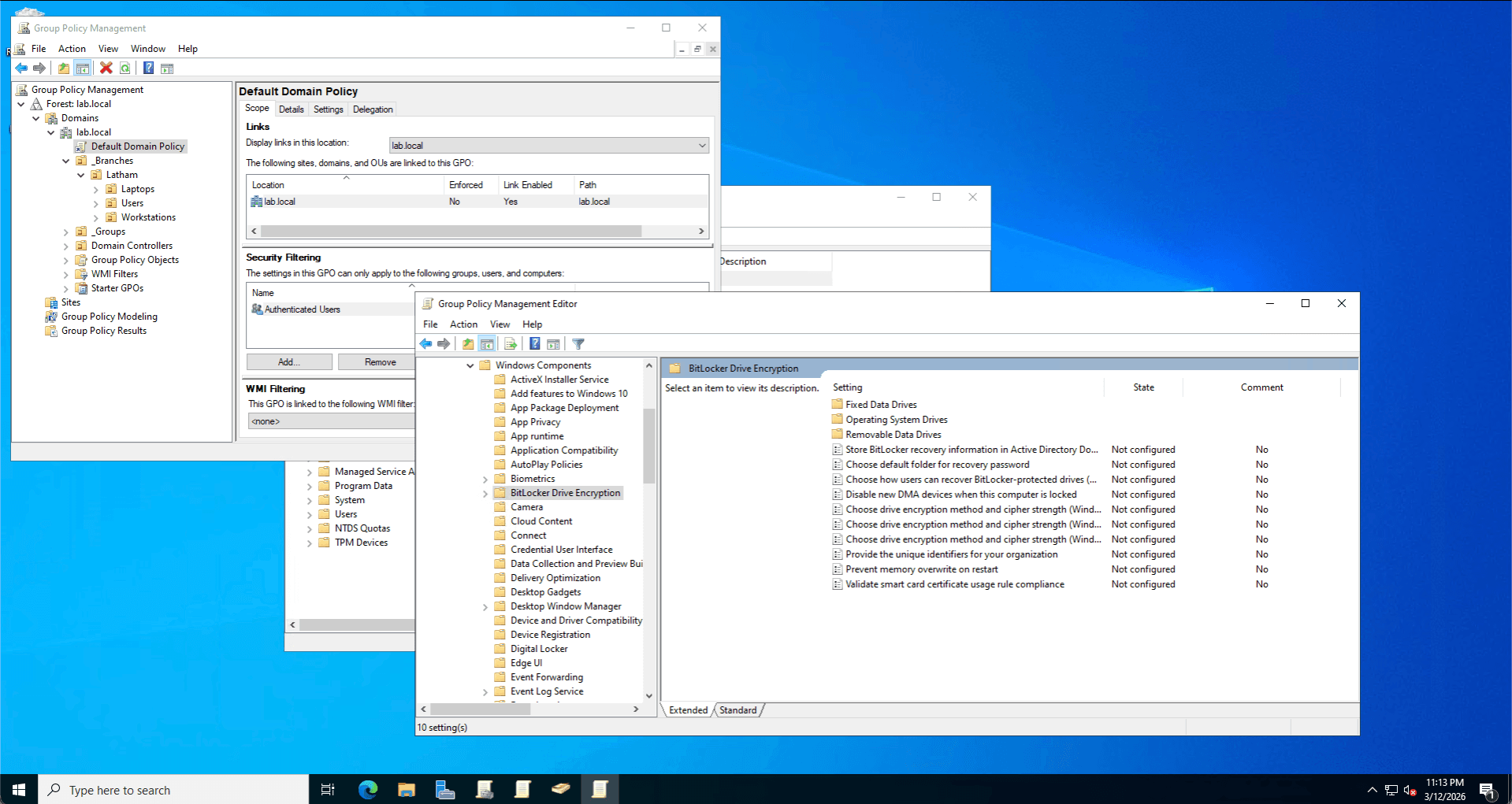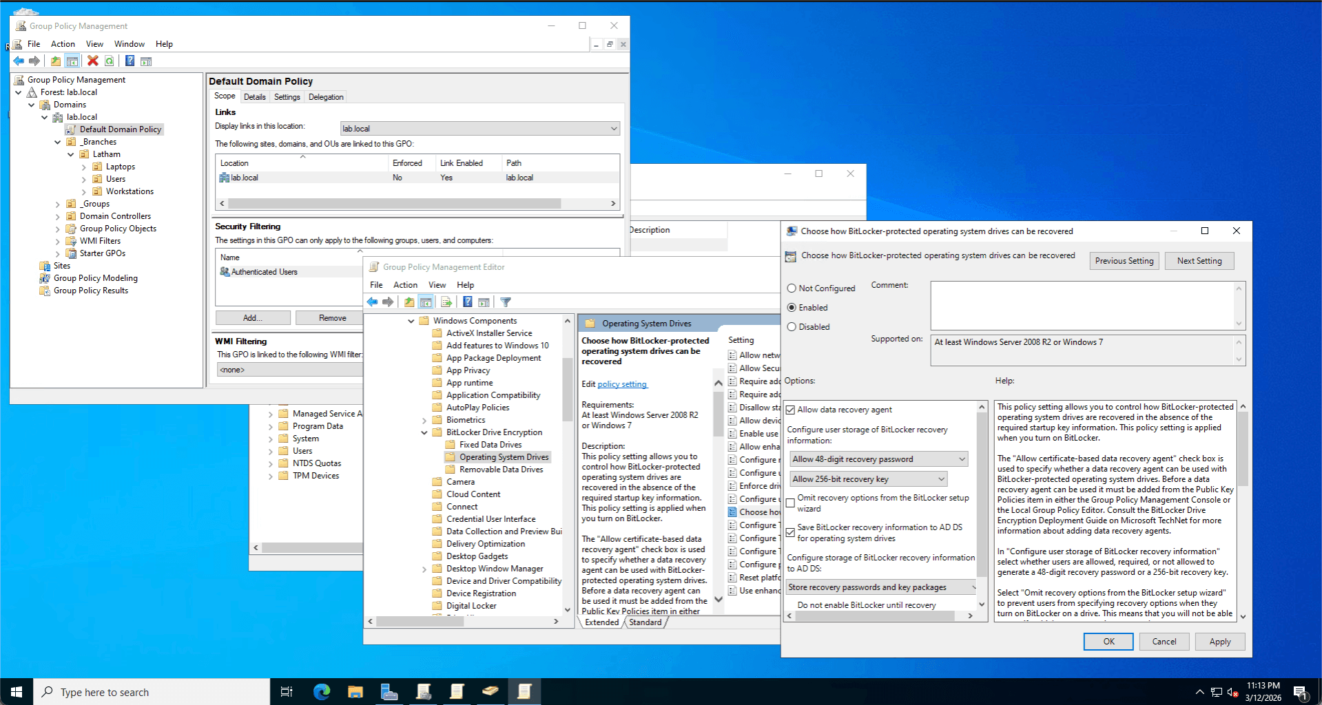 The Fix: I identified that the BitLocker Recovery Password Viewer RSAT feature was missing on the Domain Controller and installed it. To force the client to sync, I utilized the Get-BitLockerVolume and Backup-BitLockerKeyProtector PowerShell cmdlets to manually escrow the encryption key to Active Directory. I then verified the key's presence in the AD database via the Attribute Editor (msFVE-RecoveryPassword).